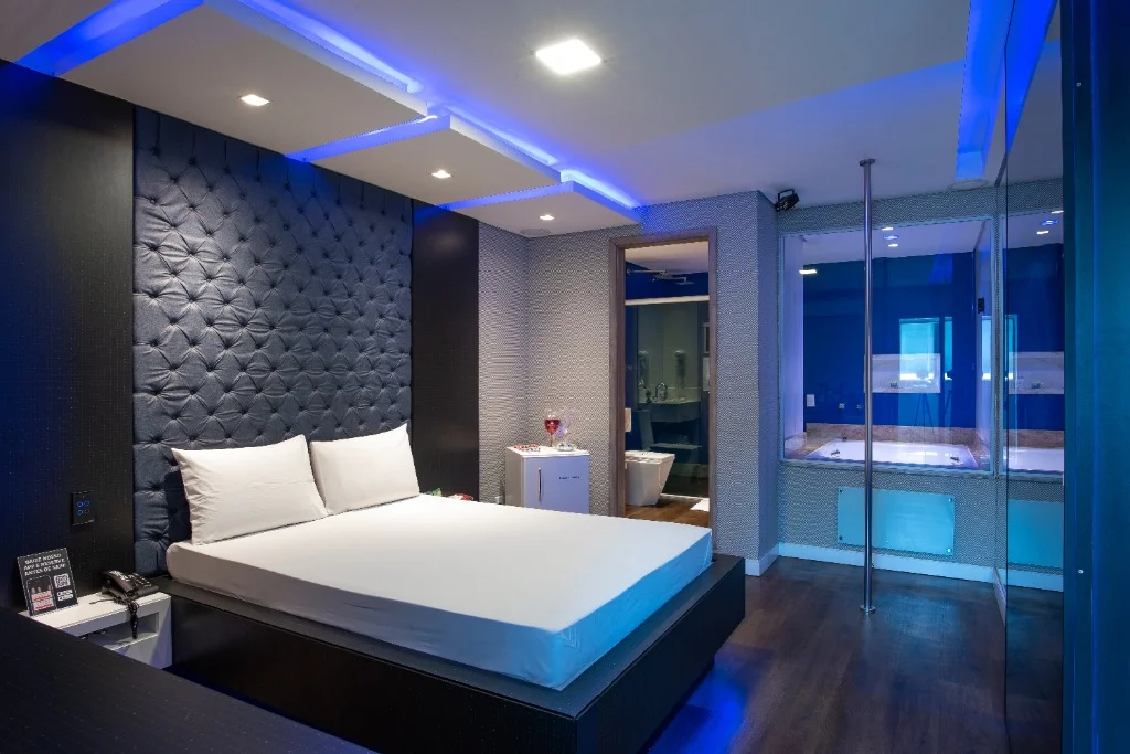 Temos suítes para todos os estilos: desde ambientes românticos e relaxantes até experiências mais animadas com iluminação tipo boate, pole dance e automação inteligente.